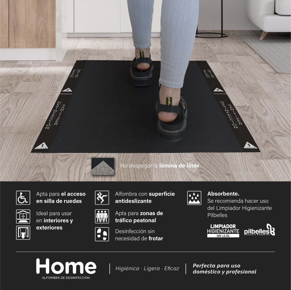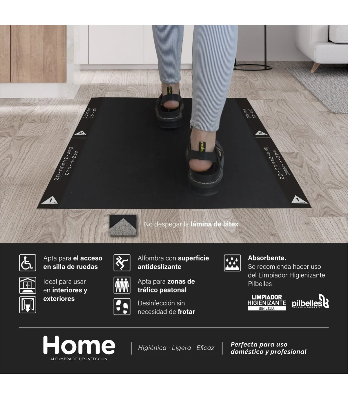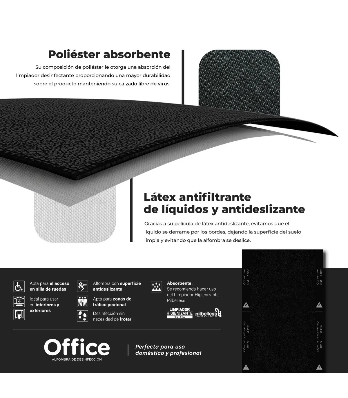 - 1 Alfombra negra de 60x80 cm provista en la parte inferior (contacto con el suelo) de una lámina de látex aislante para evitar la evaporación y pérdida de Limpiador con Oxígeno Activo (aconsejamos PILBELLESS)