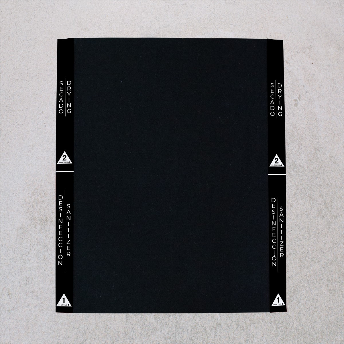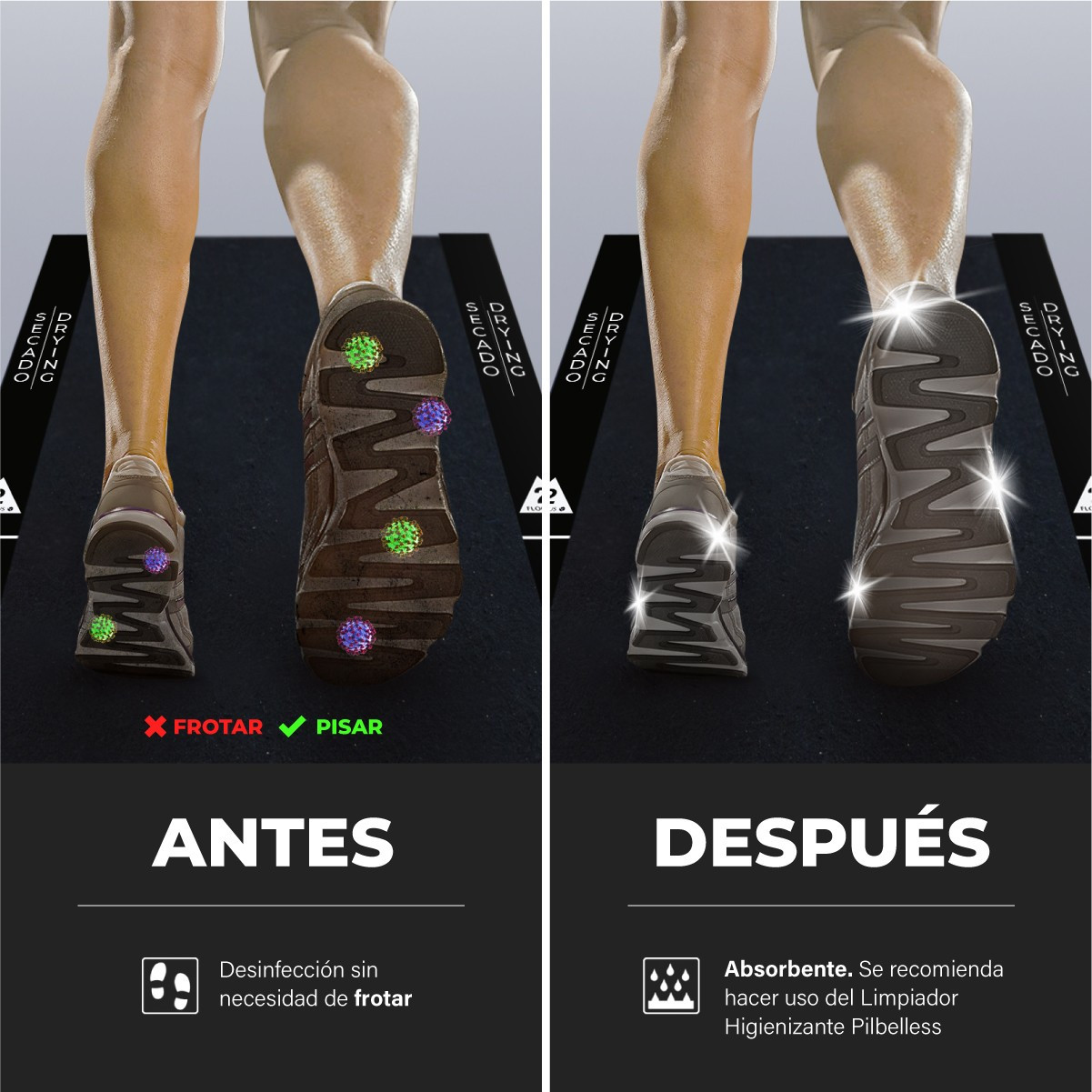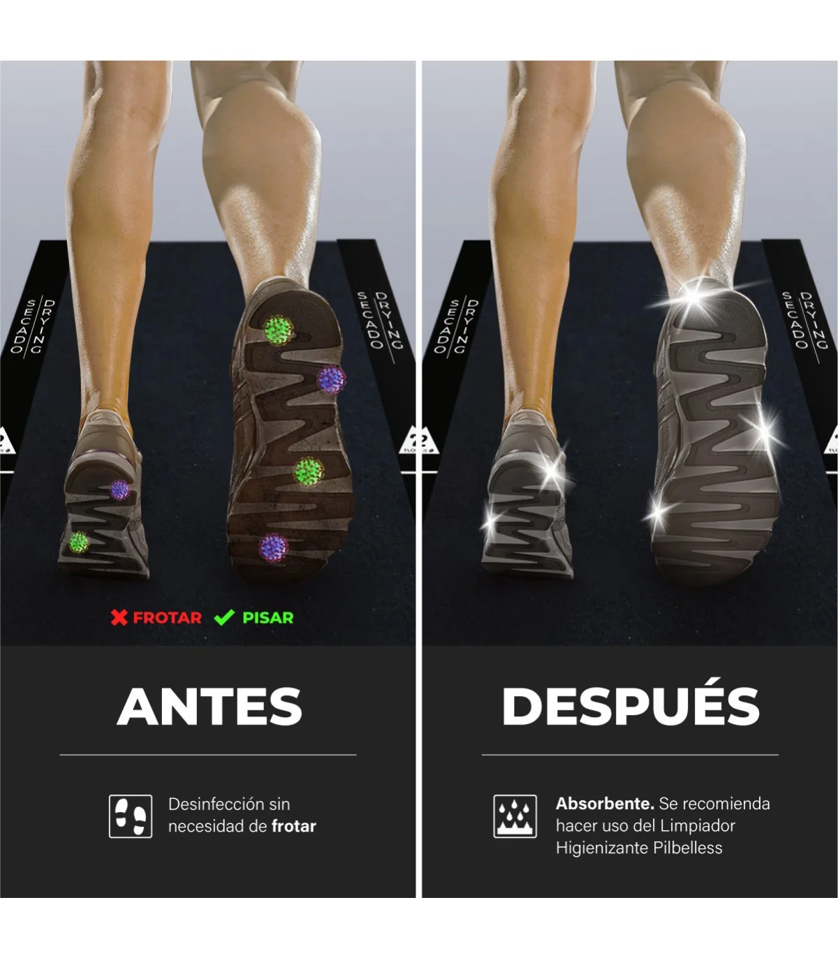 - 1 Alfombra negra de 60x80 cm provista en la parte inferior (contacto con el suelo) de una lámina de látex aislante para evitar la evaporación y pérdida de Limpiador con Oxígeno Activo (aconsejamos PILBELLESS)