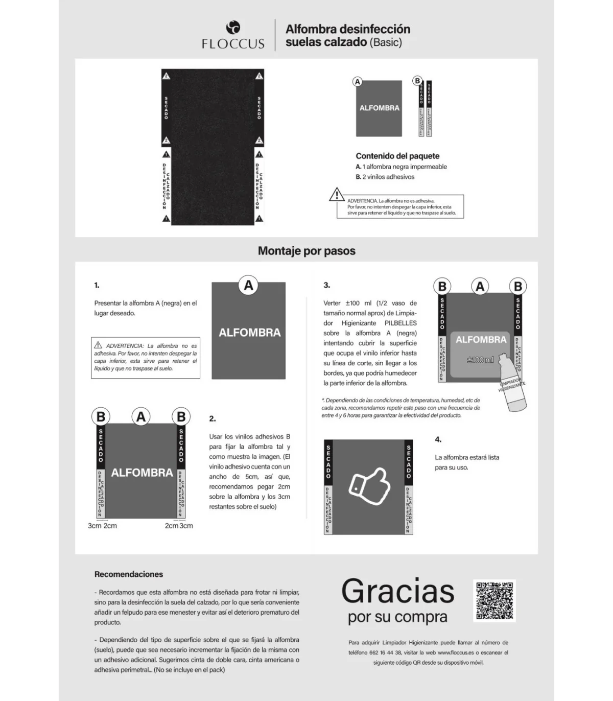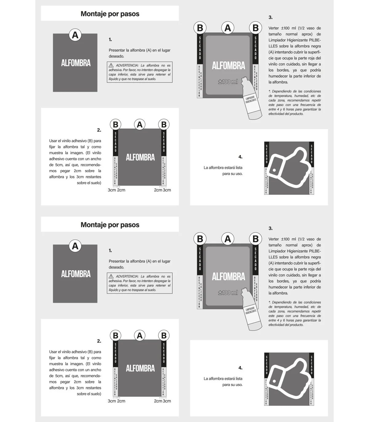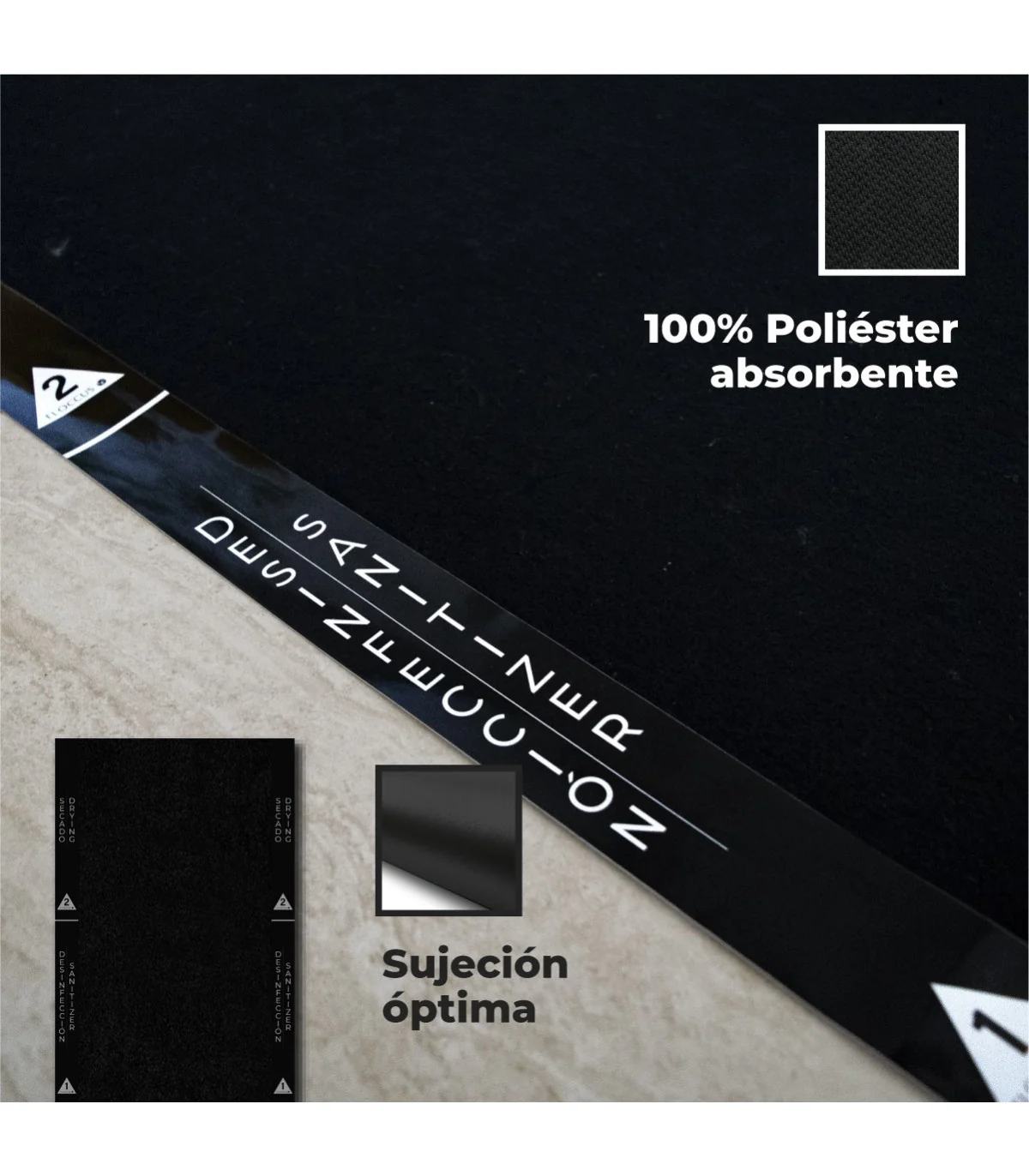 - Alfombra negra: 100% poliéster. Esta alfombra contiene una capa de látex transparente para retener el limpiador. NO despegar.