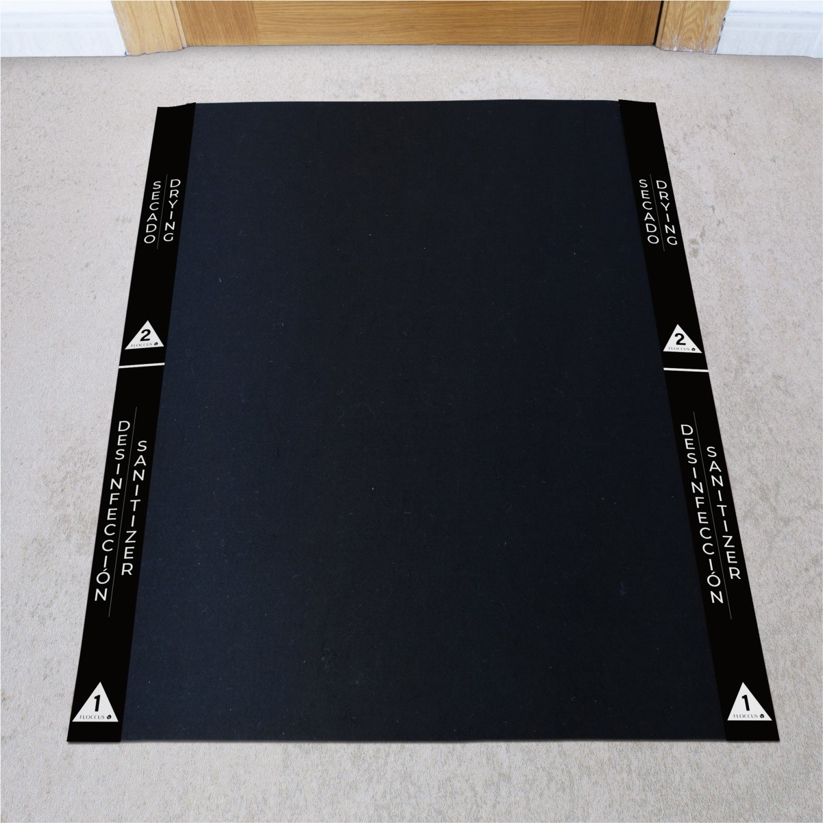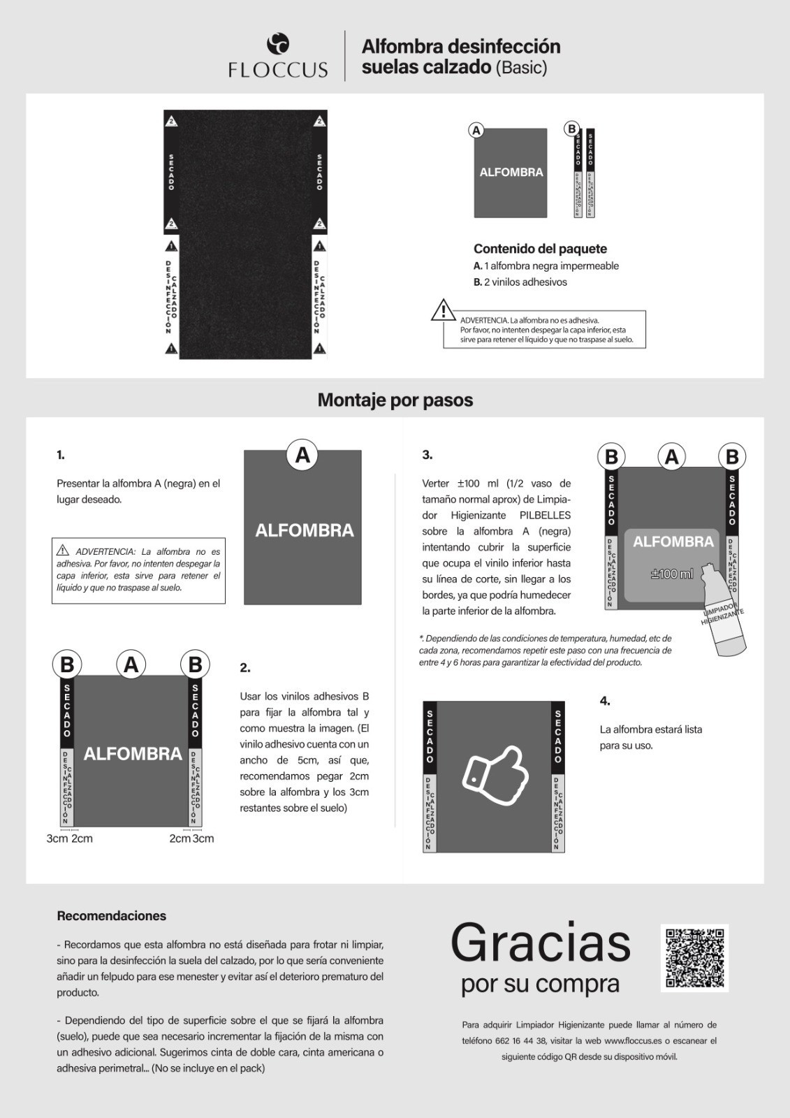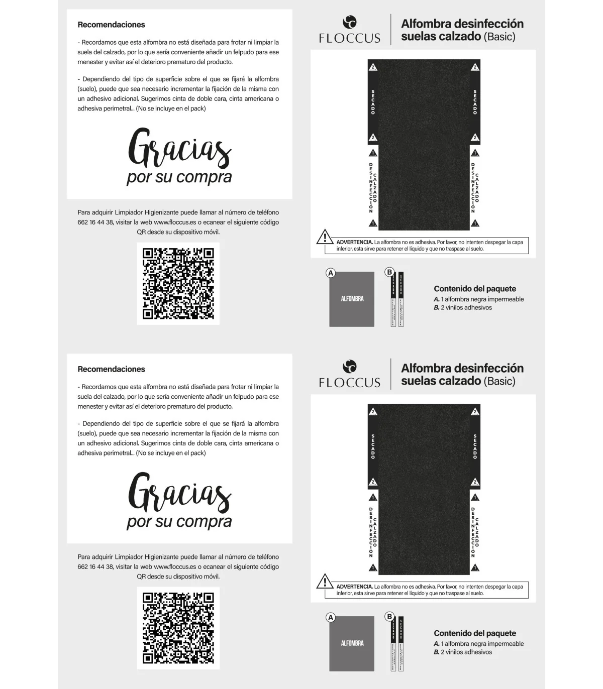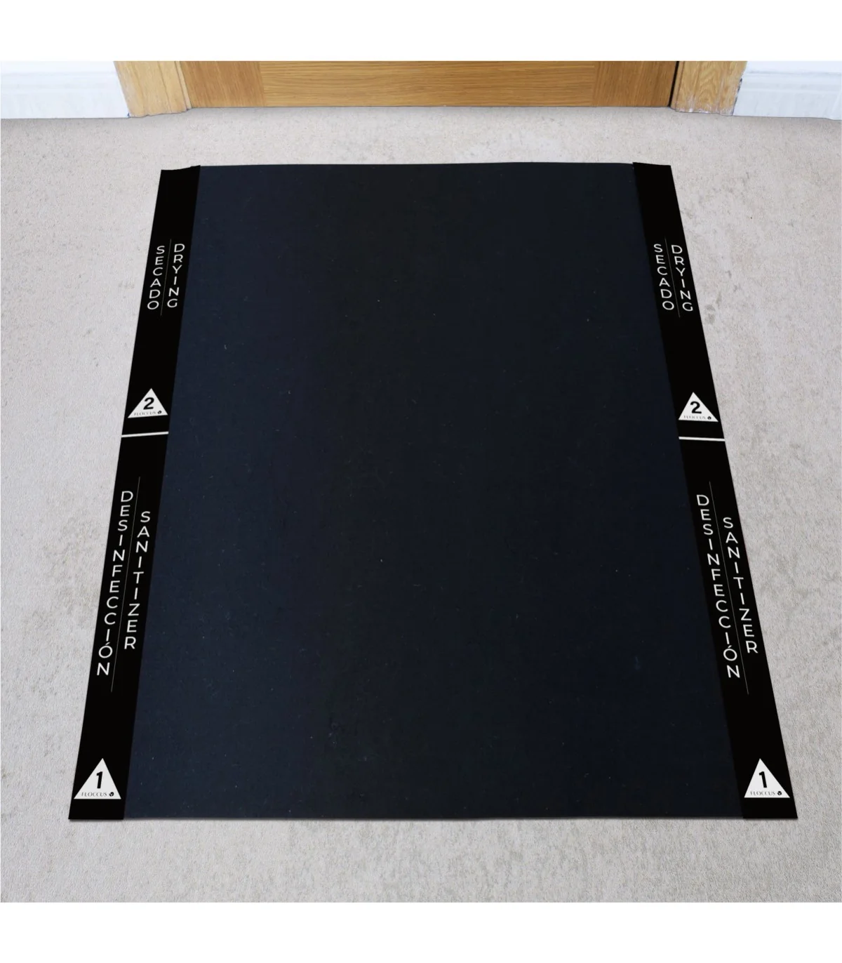 - Alfombra negra: 100% poliéster. Esta alfombra contiene una capa de látex transparente para retener el limpiador. NO despegar.