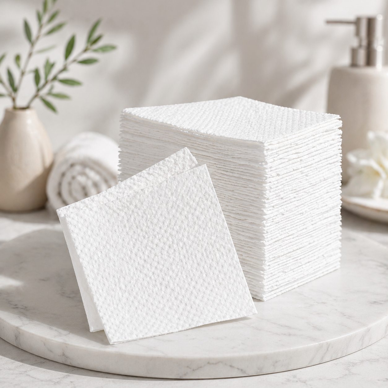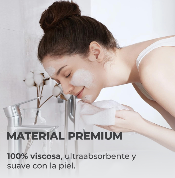 Fabricadas con 100% viscosa, estas toallas desechables para la cara ofrecen una calidad superior: son ultrabsorbentes, resistentes y suaves al tacto.