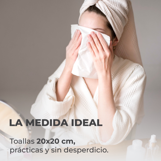Con medidas de 20x20 cm, nuestras toallas faciales desechables son lo suficientemente amplias para cubrir todo el rostro sin desperdiciar material.