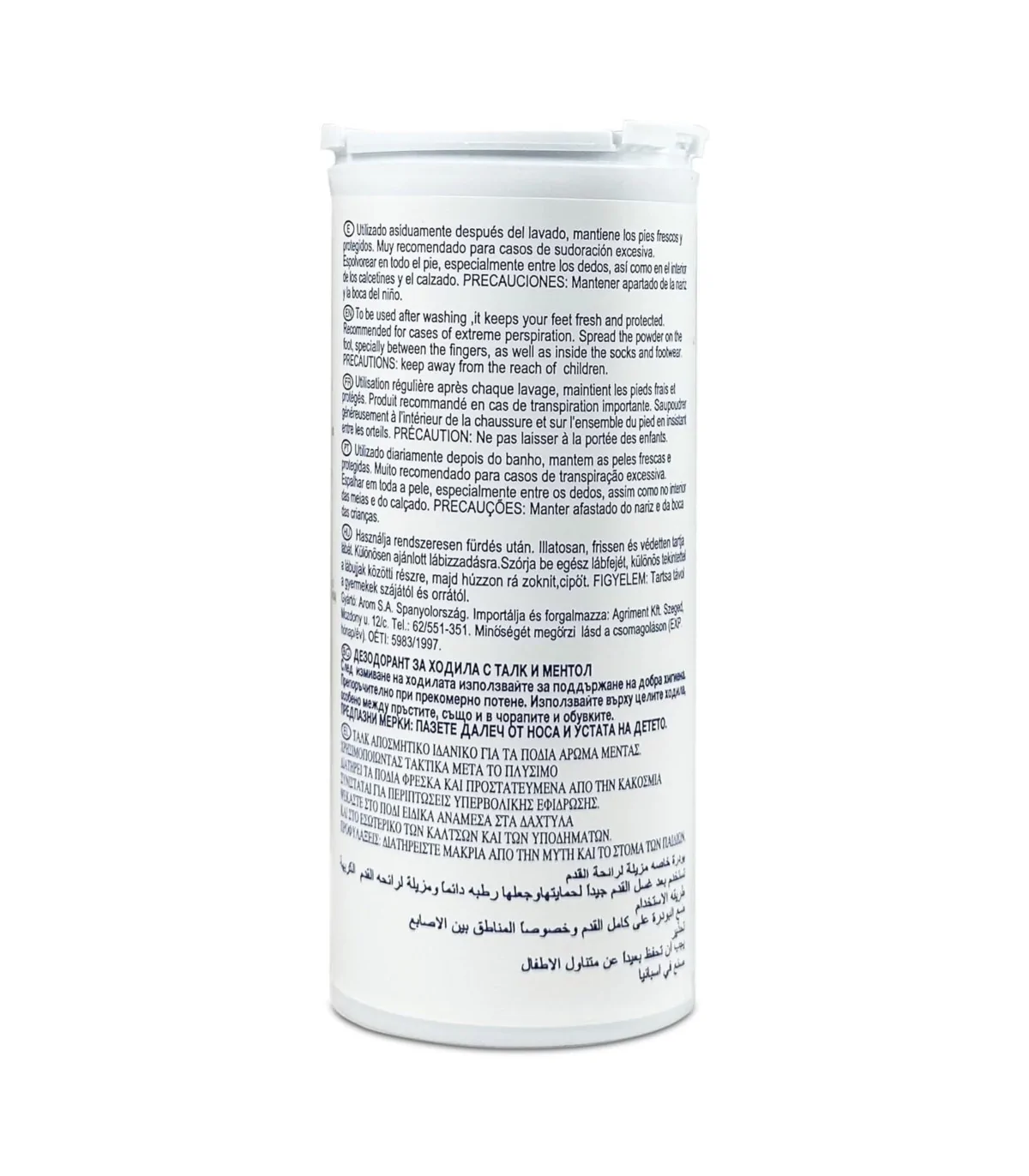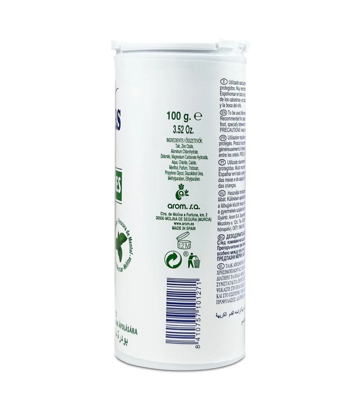 Polvos de talco para pies que ayudan a mantener la piel seca y fresca durante la jornada. Formato de 100 g, ideal para higiene diaria en entornos profesionales.