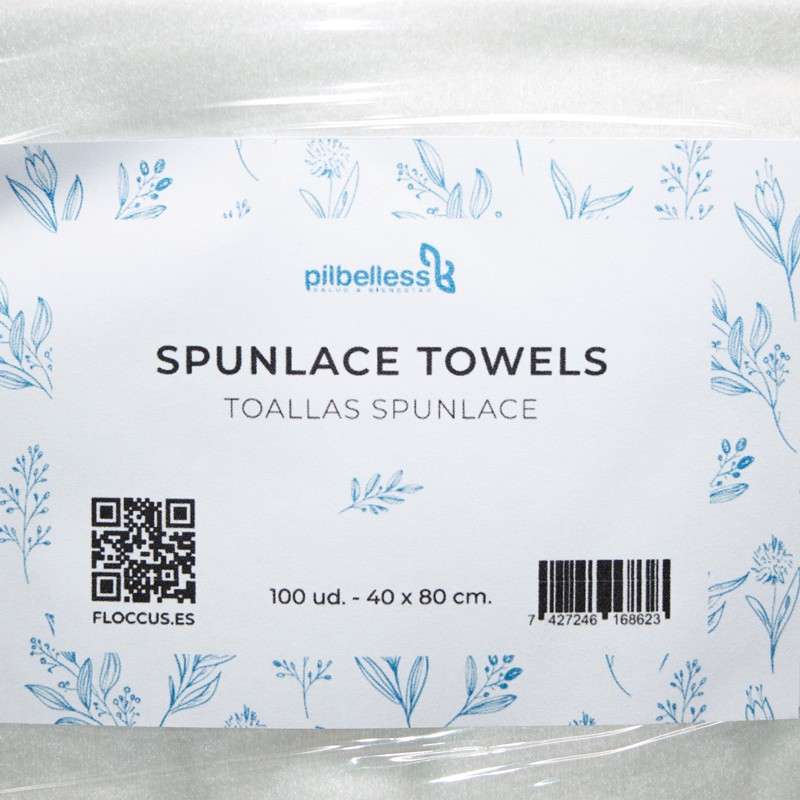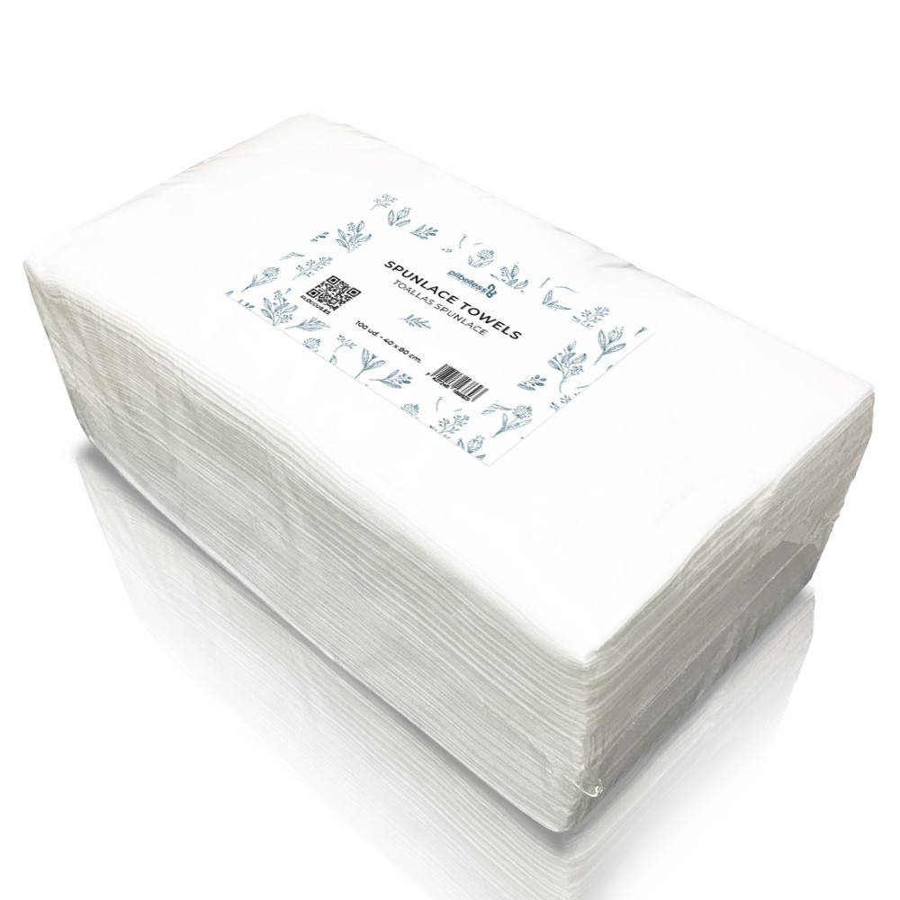 Toallas desechables de Spulance de alta absorción y tacto muy agradable. Ideales para el secado de manos, cara, cabello, espalda, pies y zonas pequeñas del cuerpo por su cómodo formato de 100 unidades de 40x80 centímetros.